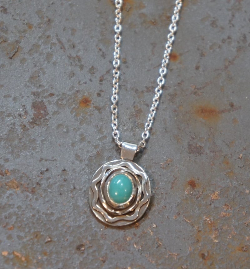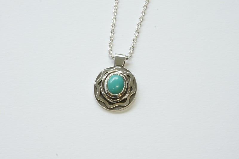 ターコイズの周りにウェーブラインを入れたシルバーネックレスです。