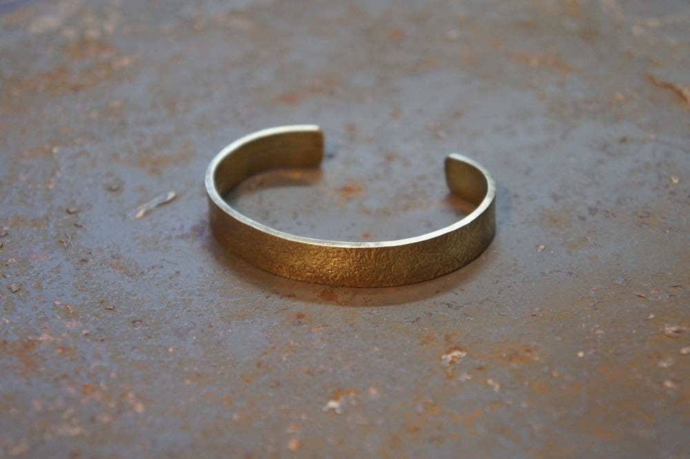 オリジナルの刻印を使ってモルタルの様な風合いに仕上げたブラスバングルです。