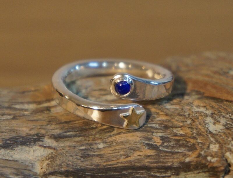 鎚目を入れたリングに真鍮の星、ラピスラズリをつけたシルバーリングです。
