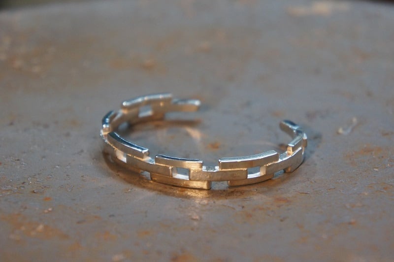 3種類の太さのシルバーパーツをチェーン風の形状に組み合わせたバングルです。