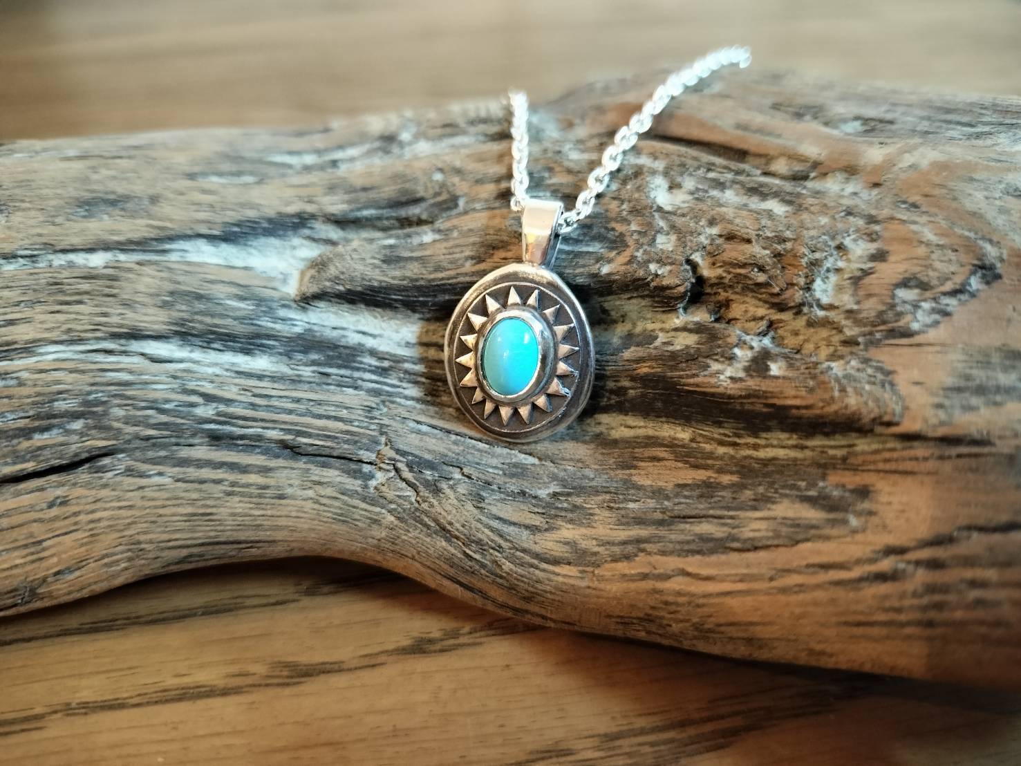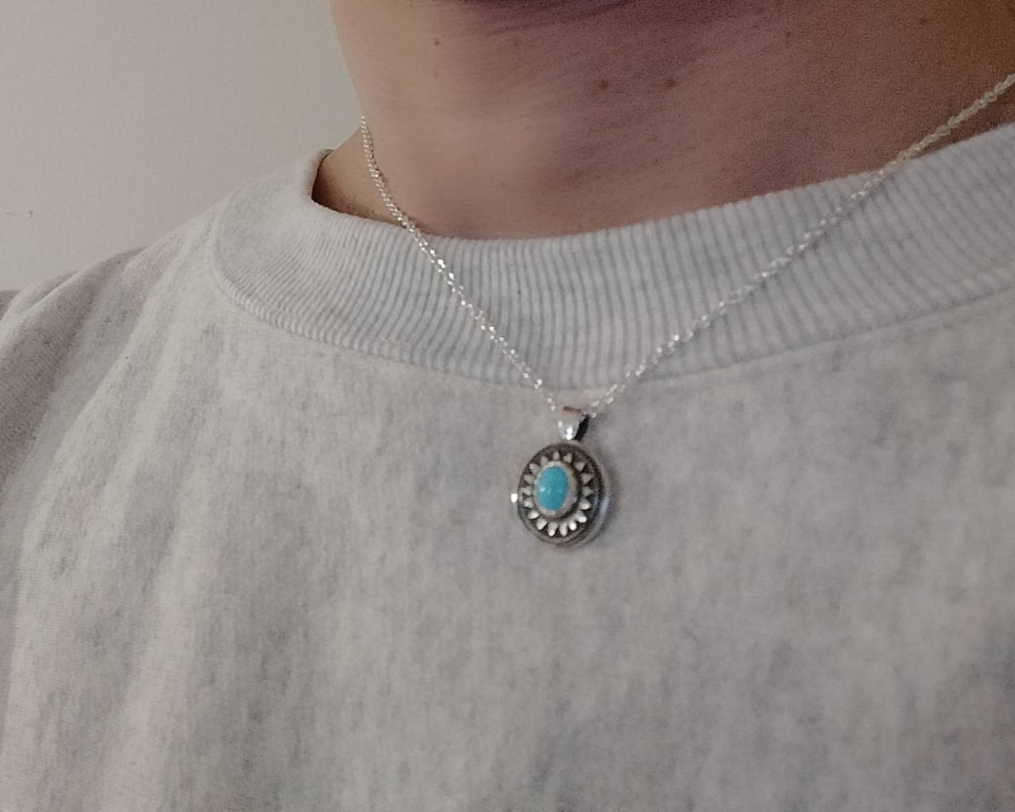 太陽をモチーフにしたトップにアリゾナ産のターコイズを付けたシルバーネックレスです。